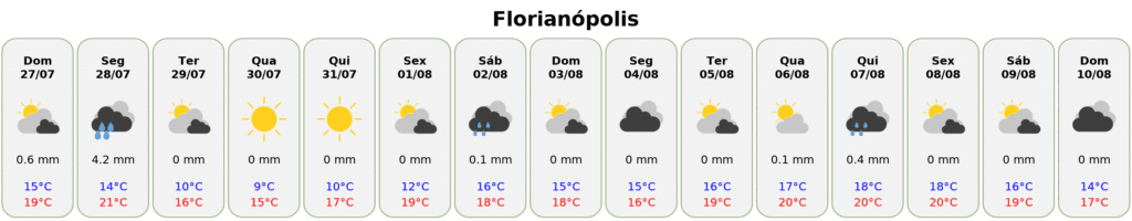 A maior instabilidade do período está prevista para a segunda-feira, 28 de julho, quando os acumulados chegam a 4,2 mm. Nos demais dias (29 a 31/07), o tempo será seco e com predomínio de sol. As temperaturas variam entre 9°C e 21°C.
