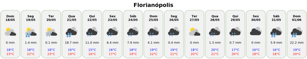 - Terça (20/05): Chuva leve (0,1 mm), com sol entre nuvens.
