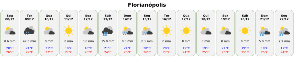 - Terça-feira (16/12): Tempo firme e ensolarado. Sem previsão de chuva. Mínima de 20°C e máxima de 27°C.