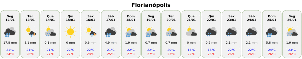 A previsão do tempo para Florianópolis entre os dias 12 e 26 de janeiro aponta uma semana marcada por instabilidade nos primeiros dias, seguida por períodos de sol, e novamente com retorno das chuvas na segunda metade do período.