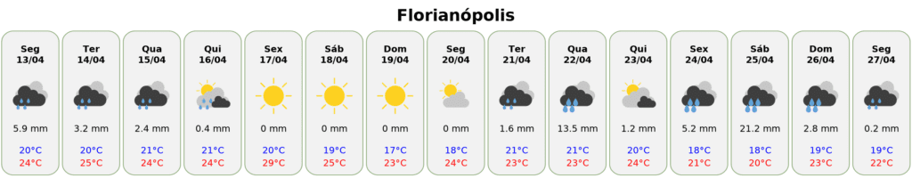 A previsão do tempo para Florianópolis indica uma semana marcada por instabilidade no início e no fim do período, intercalada com dias de tempo firme e presença de sol. Entre sexta-feira (17) e segunda-feira (20), o tempo abre e as temperaturas sobem, com máximas próximas dos 29°C. Já na segunda metade da semana seguinte, a chuva volta com maior intensidade, especialmente na quarta (22) e no sábado (25), quando os acumulados são mais elevados.