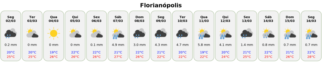 A previsão do tempo para Florianópolis entre segunda-feira (02) e segunda-feira (16) indica uma semana marcada por alternância entre períodos de sol, aumento de nuvens e pancadas de chuva, algumas com volumes mais expressivos, especialmente a partir do fim de semana. As temperaturas permanecem elevadas ao longo do período, com máximas variando entre 22°C e 28°C, mantendo a sensação de abafamento em diversos dias.