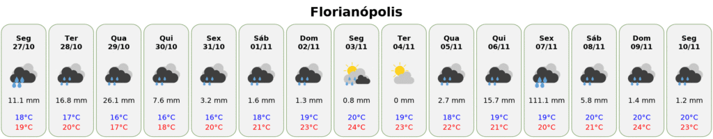- Terça (28/10) — Instabilidade continua, com 16,8 mm de chuva. Mínima de 17°C, máxima de 20°C.