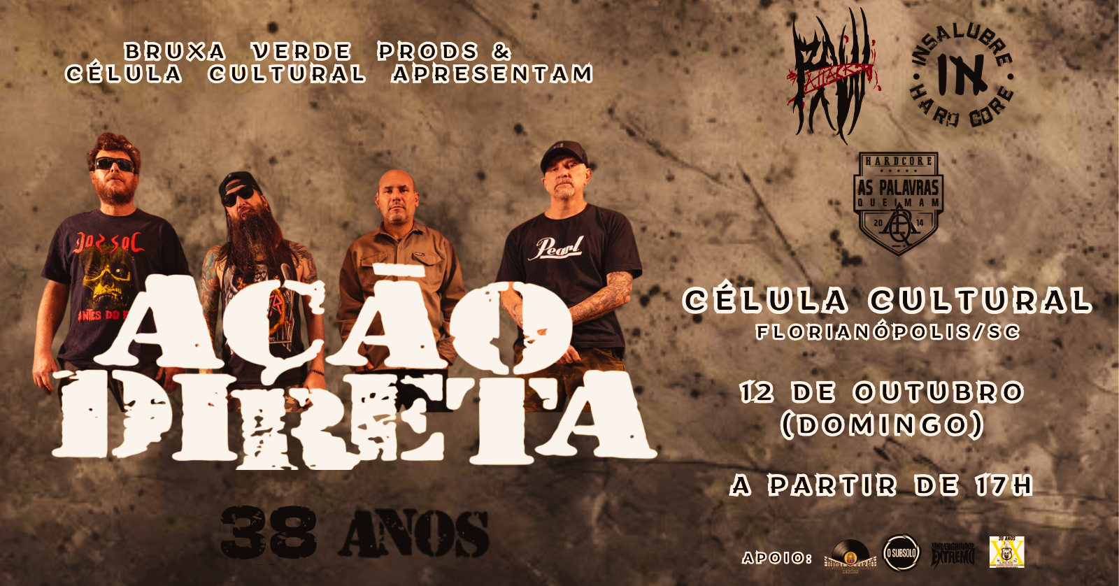 A produtora Bruxa Verde Produções tem a honra de promover o retorno da icônica banda de hardcore Ação Direta à cidade de Florianópolis, no espaço Célula Cultural, após um longo tempo. O quarteto, que promove sua tour de 38 anos de banda e se apresentou no último ano no reconhecido festival Obscene Extreme, passará pela cidade para um show no Célula no Domingo (12).