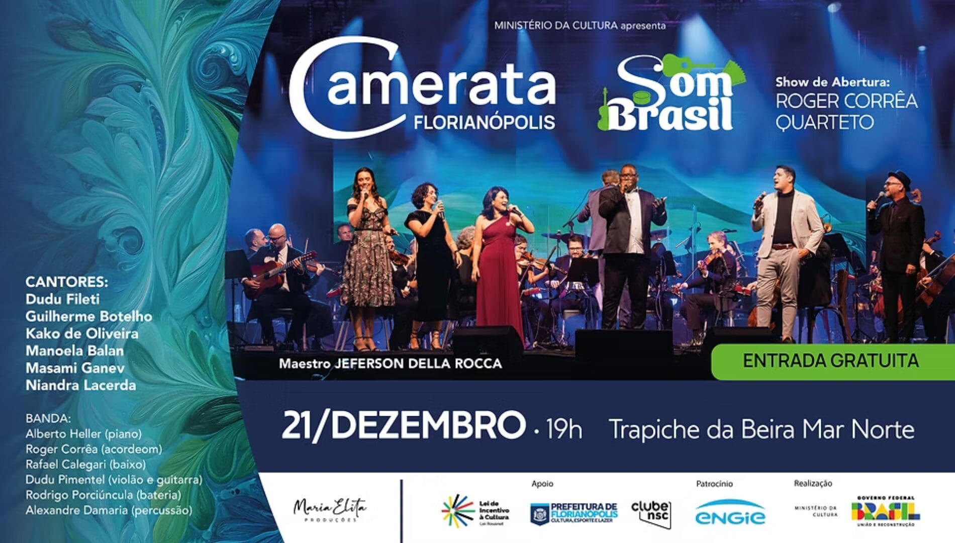 Antes da apresentação principal, o palco recebe o Roger Corrêa Quarteto, que abre a noite com um show especial. Em seguida, sob a regência do maestro Jeferson Della Rocca, a Camerata divide o palco com os cantores Dudu Fileti, Guilherme Botelho, Manoela Balan, Masami Ganev, Niandra Lacerda e Kako de Oliveira.