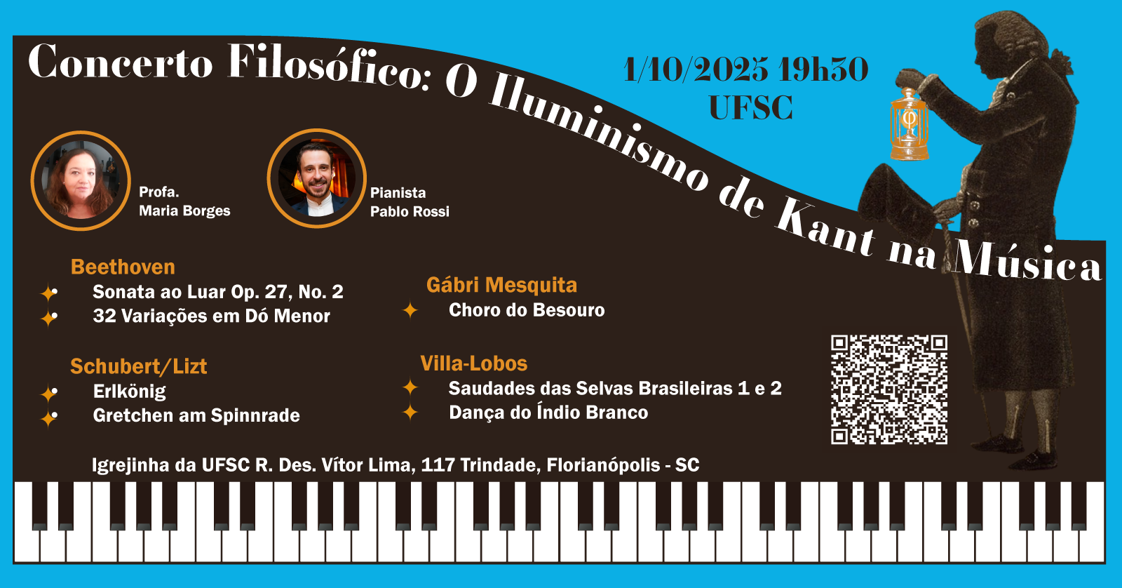 Como parte da programação do XI Multilateral Kant Colloquium, a Professora Maria de Lourdes Borges e o renomado pianista Pablo Rossi apresentam o Concerto Filosófico: O Iluminismo de Kant na Música, um evento que une filosofia e arte para explorar, por meio da música, as ideias centrais do Iluminismo kantiano.