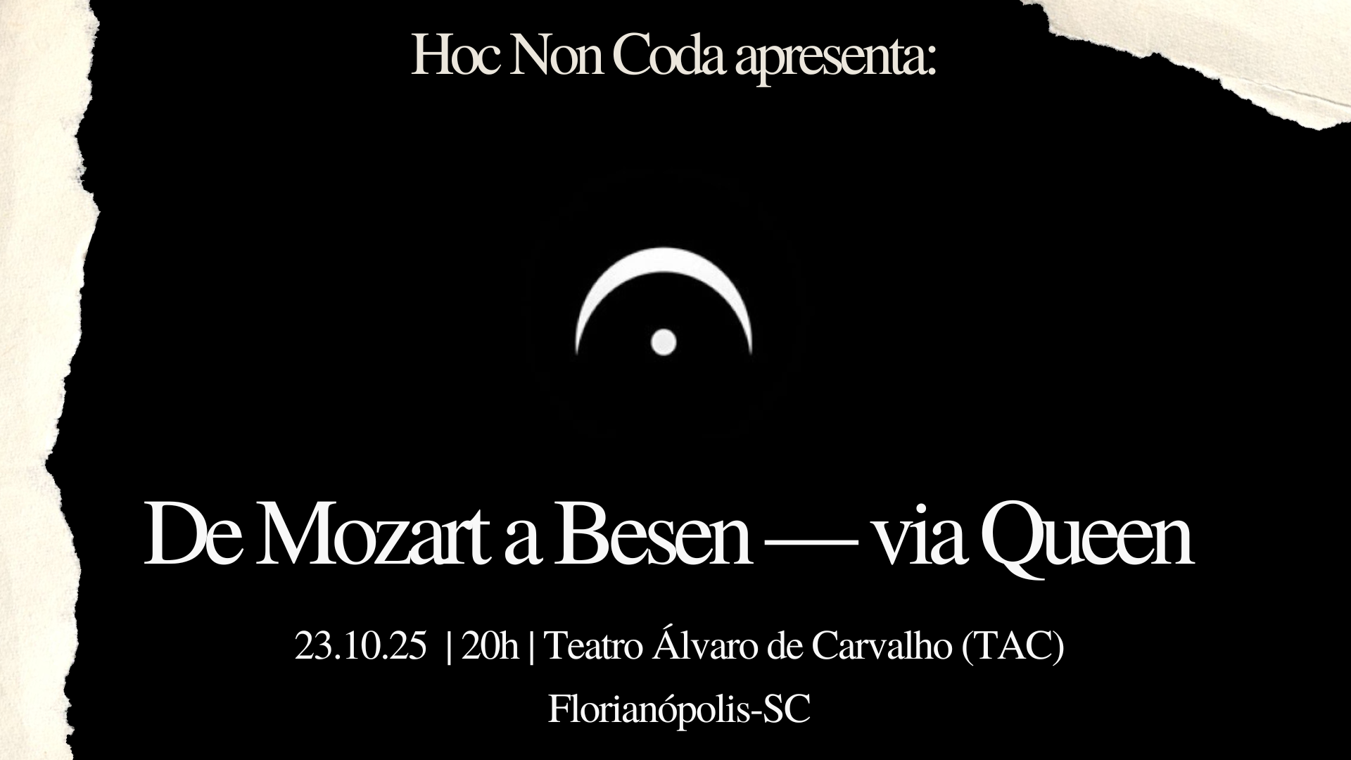 O concerto De Mozart a Besen – Via Queen propõe uma jornada musical que conecta três universos distintos – mas profundamente relacionados – presentes no repertório do Hoc Non Coda. A proposta não é seguir uma linha cronológica ou linear, mas sim revelar como Mozart, Carlos Besen e a banda Queen se tornaram bases fundamentais para este espetáculo e para a identidade artística do grupo.