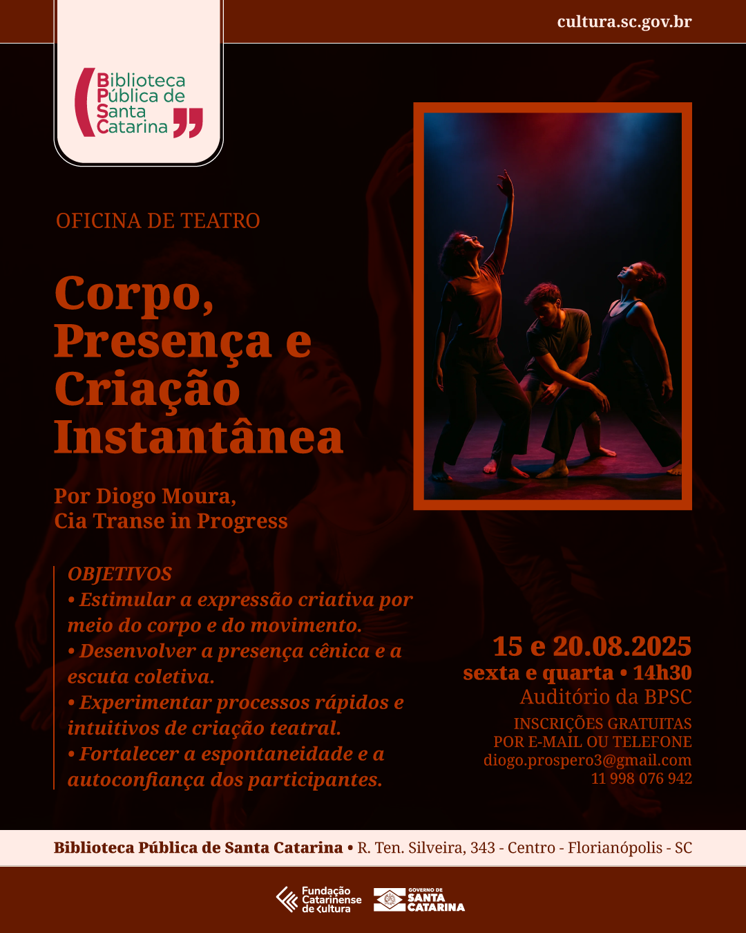 Conduzida por Diogo Moura (Cia Transe in Progress), a oficina utiliza técnicas de teatro físico, improvisação e respiração para desbloquear o corpo como instrumento expressivo, enquanto a palavra se torna extensão da experiência sensorial.