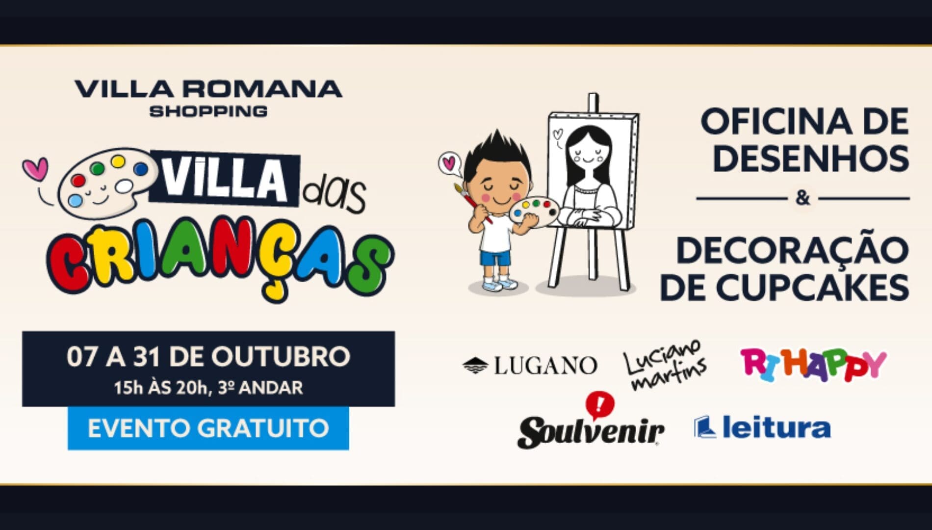 Durante os dias 7 a 12 de outubro, das 15h às 20h, as crianças poderão participar de oficinas de desenho com ilustrações do artista plástico Luciano Martins e de decoração de cupcakes em parceria com a Lugano. As atividades acontecem no espaço Villa das Crianças, no 3º andar, e não exigem inscrição prévia.
