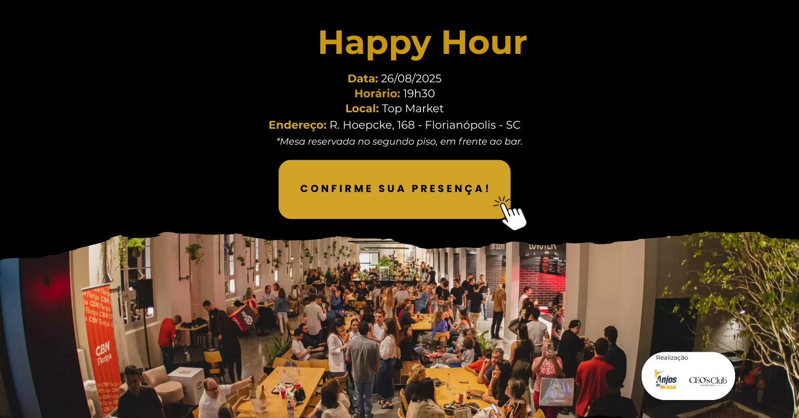 O Happy Hour será no formato “cada um paga o seu”, mas a mesa está garantida para o nosso grupo.