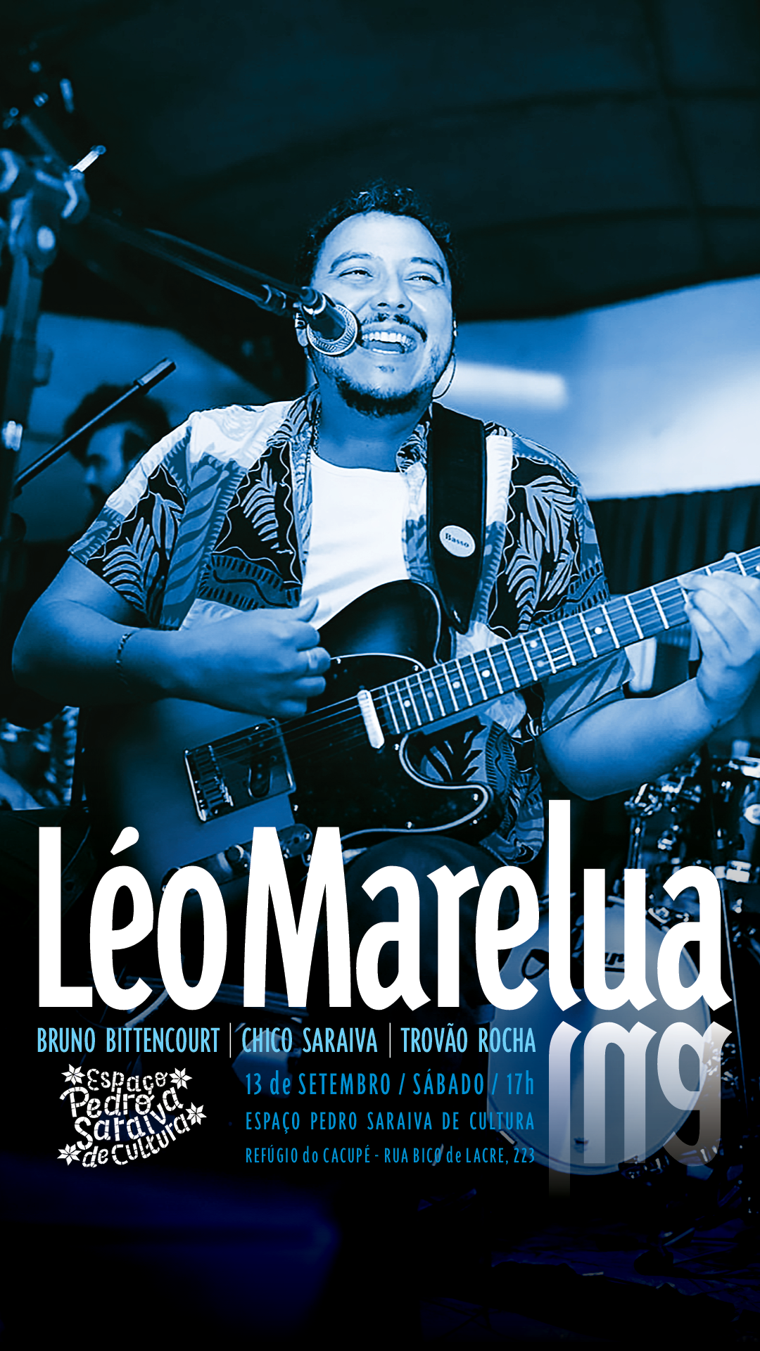 Léo Marelua, frente da banda Marelua, convoca seus aliados pra fazer uma boca de noite de balanço, divertida, leve e de celebração do momento. Em set list com base nas suas canções autorais, que serão temperadas por um ijexá do parceiro (e anfitrião aqui) Chico Saraiva, e mais outros clássicos de Tim Maia, Seu Jorge e Jorge Benjor