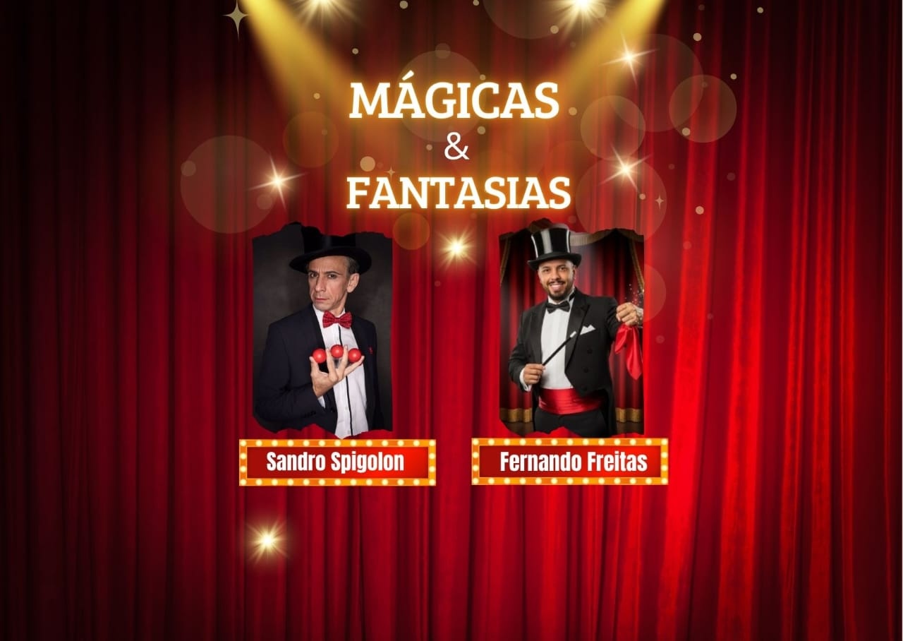 Fernando Freitas e Sandro Spigolon sobem ao palco para uma tarde de magia ao vivo, cheia de humor, interação e surpresas que acontecem bem diante dos seus olhos.