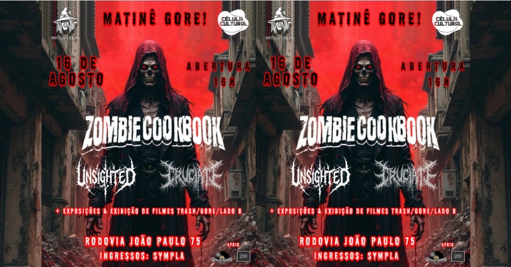 Estamos chegando no Célula Cultural nesse próximo mês de forma inédita: nossa primeira matinêzona na casa vai tomar forma com uma apresentação destruidora que juntará o Death Metal das bandas Zombie Cookbook (Joinville), Cruciate (Fln) e Unisghted (Fln), esta em sua estreia oficial, evocando a temática do gore unida ao Metal Extremo, com três bandas animais da vertente.