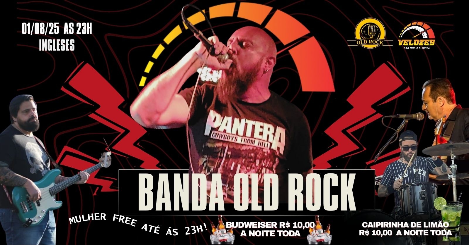 Prepare-se para uma noite de puro rock’n’roll com a banda OLD ROCK, mandando ver os maiores clássicos dos anos 70, 80 e 90 no palco da Velozes!