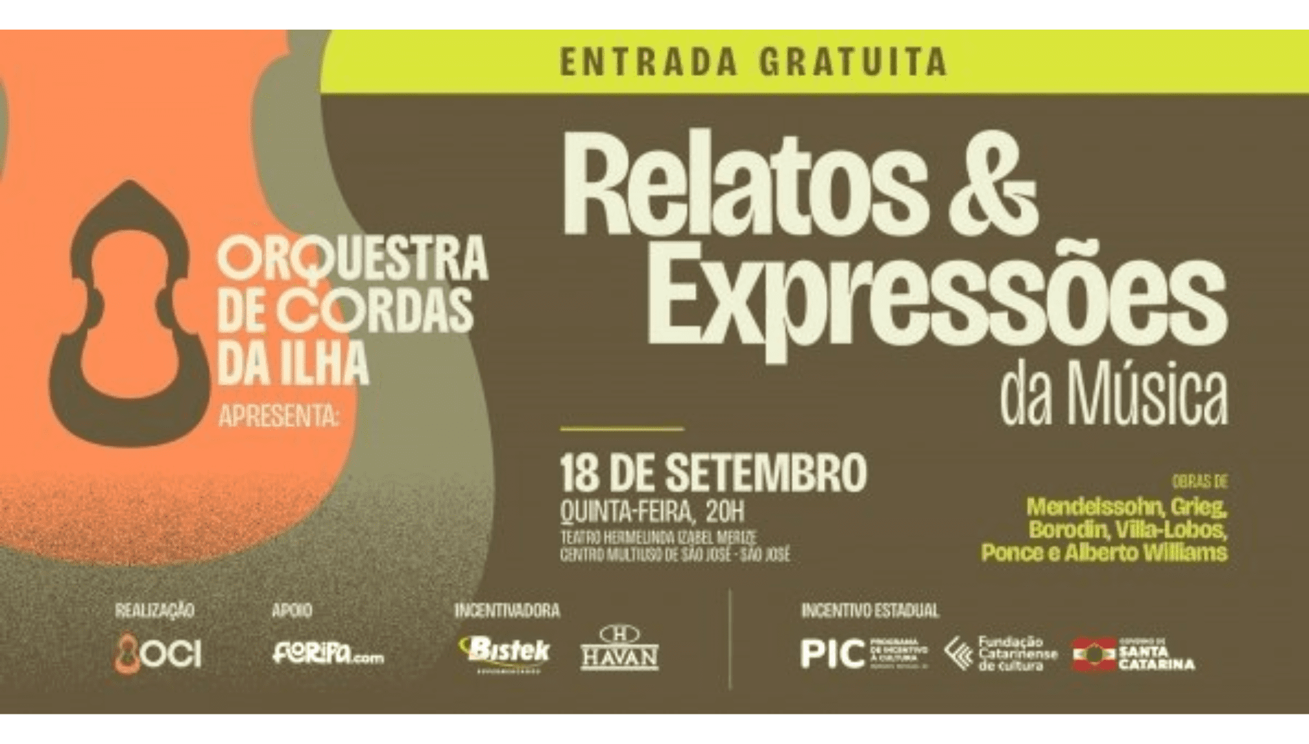 A Orquestra de Cordas da Ilha (OCI) sobe ao palco do Teatro Hermelinda Izabel Merize, no Centro Multiuso de São José, na próxima quinta-feira, 18 de setembro, às 20h, em mais uma etapa do projeto Relatos e Expressões da Música. A apresentação é gratuita, mediante inscrição prévia pelo Sympla.