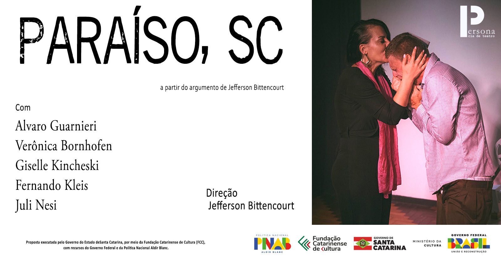 Paraíso, SC é encenado exclusivamente com elementos musicais e ações físicas dos atores — não há texto falado em cena. A proposta amplia o estudo da musicalidade na construção cênica, foco da pesquisa da Persona Cia de Teatro desde sua fundação, explorando a escuta sensível do ator e do espectador.