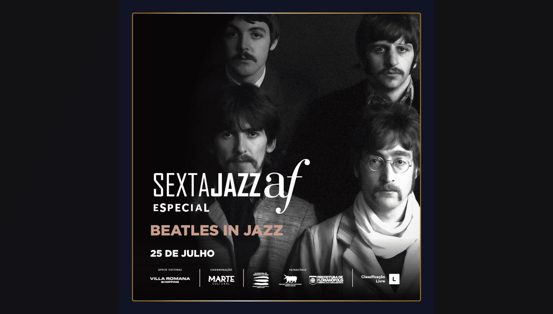 A influência do jazz na obra dos Beatles será celebrada em um concerto especial no dia 25 de julho, às 20h, no Piso G2 do Villa Romana Shopping, em Florianópolis. Com entrada gratuita, a apresentação integra a programação do projeto Sexta Jazz AF, promovido pela Aliança Francesa da capital catarinense.