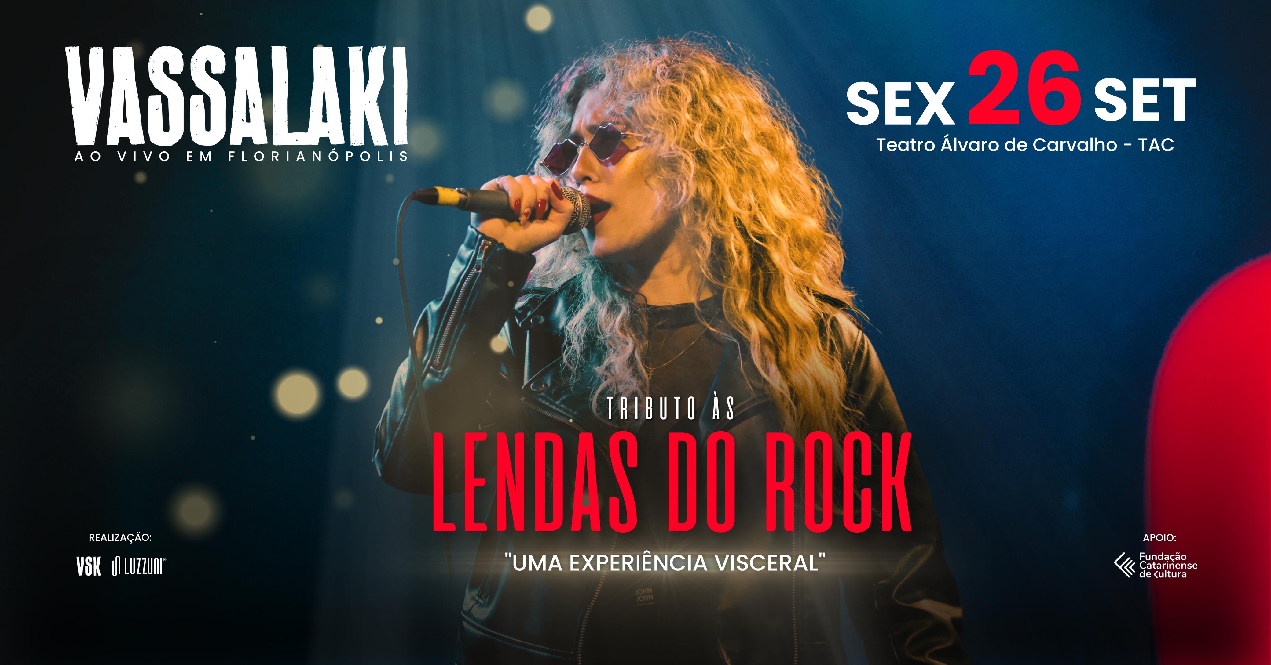 No dia 26 de setembro de 2025, às 20h, o Teatro Álvaro de Carvalho (Florianópolis) será tomado pela energia da VASSALAKI, que interpreta com potência e emoção clássicos eternos de Led Zeppelin, Tina Turner, AC/DC, Guns N’ Roses, Deep Purple, Black Sabbath, Iron Maiden, Survivor, Scorpions, Aerosmith, Peral Jam e outros ícones que marcaram gerações.