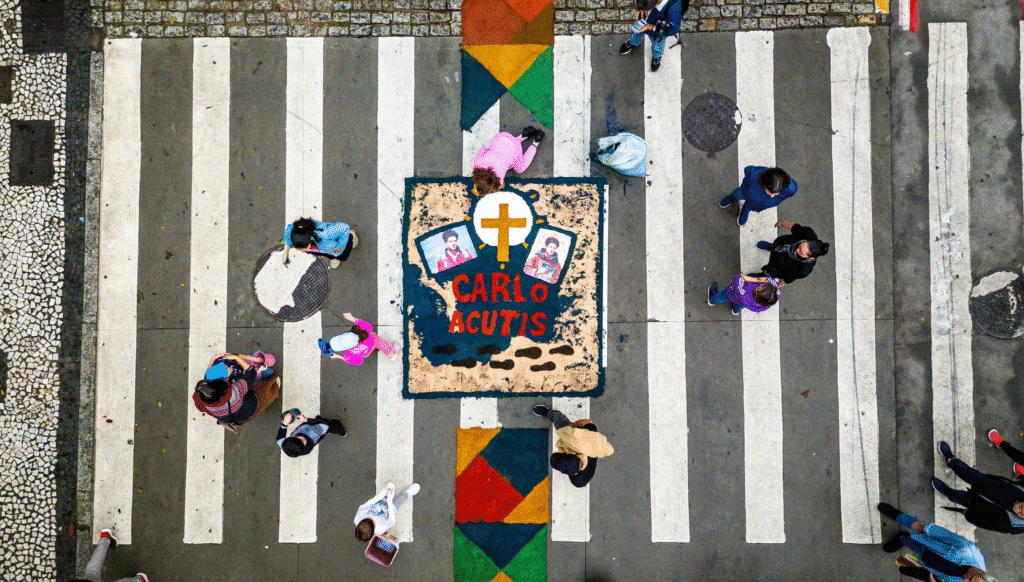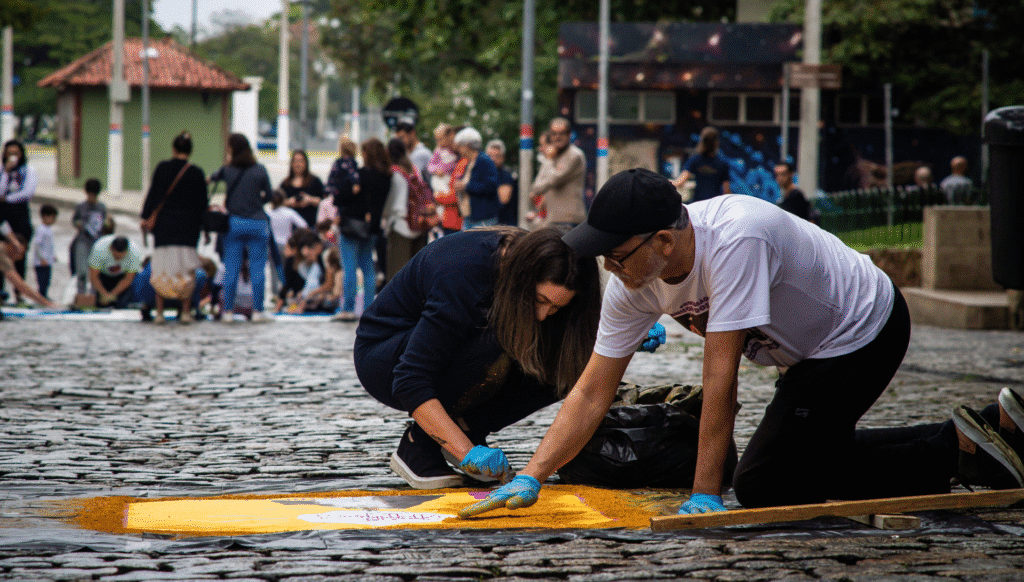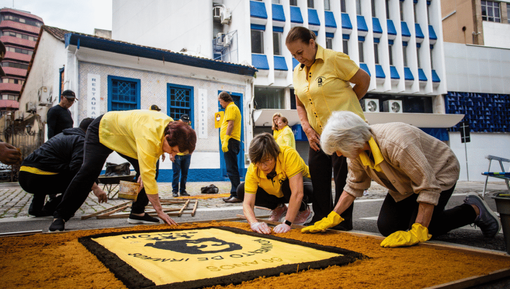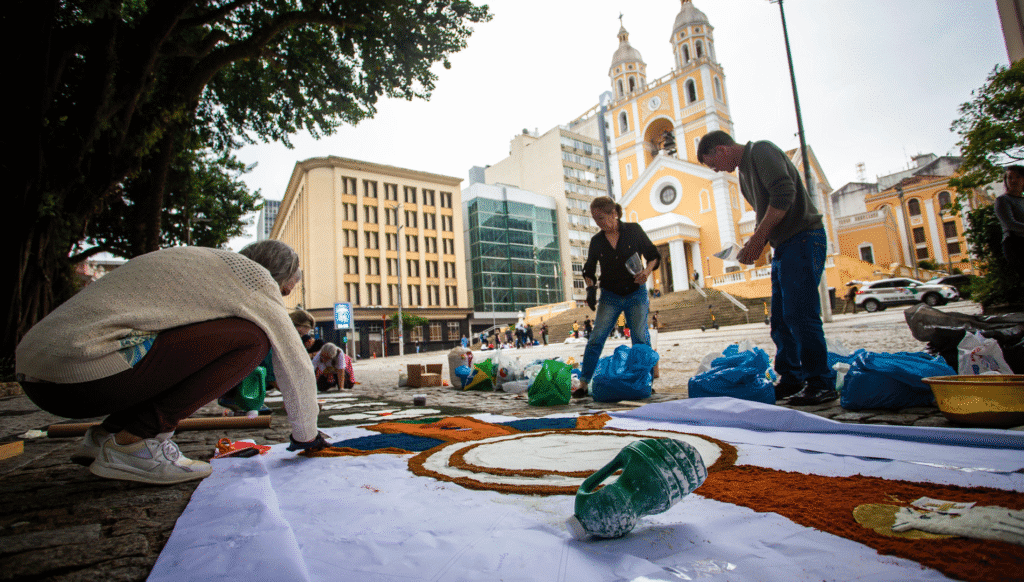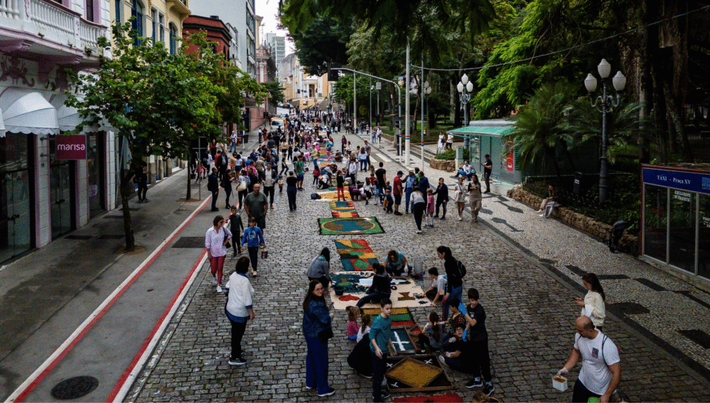 Nem mesmo o céu nublado ao longo da quinta-feira (19), foi capaz de ofuscar a tradicional Solenidade de Corpus Christi no Centro de Florianópolis. Desde as primeiras horas do dia, a Praça XV de Novembro e arredores ganharam cores e formas com a confecção dos tapetes ornamentais, uma expressão de fé e dedicação coletiva. Famílias, voluntários, grupos pastorais e estudantes se uniram na montagem dos tapetes feitos com materiais como serragem, sal e café, criando um caminho simbólico para a passagem do Santíssimo Sacramento.