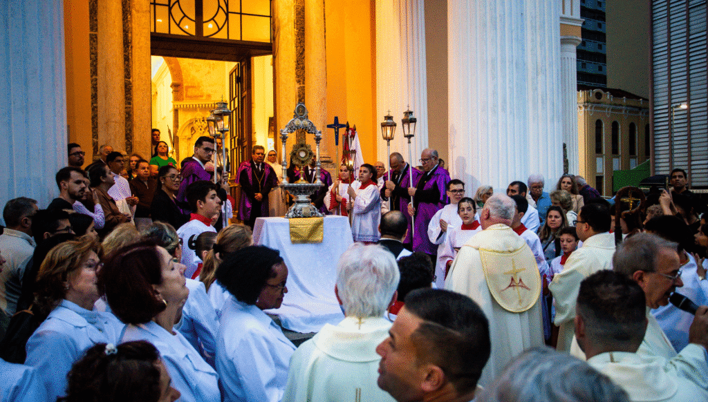 À tarde, a solenidade teve seu ponto alto com a Missa Solene celebrada pelo Arcebispo Dom Wilson Tadeu Jönck, SCJ, nas escadarias da Catedral Metropolitana. Em seguida, a procissão percorreu as ruas centrais da capital, reunindo milhares de fiéis em um testemunho público de devoção e unidade.